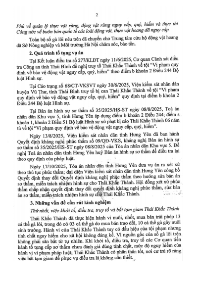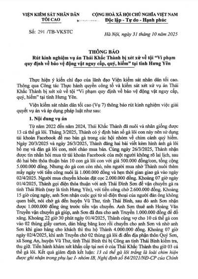 Ngày 31/10/2025, Viện kiểm sát nhân dân tối cao đã ban hành Thông báo số 291/TB-VKSNDTC về việc rút kinh nghiệm vụ án Thái Khắc Thành bị xét xử về tội “Vi phạm quy định về bảo vệ động vật nguy cấp, quý, hiếm” tại tỉnh Hưng Yên.